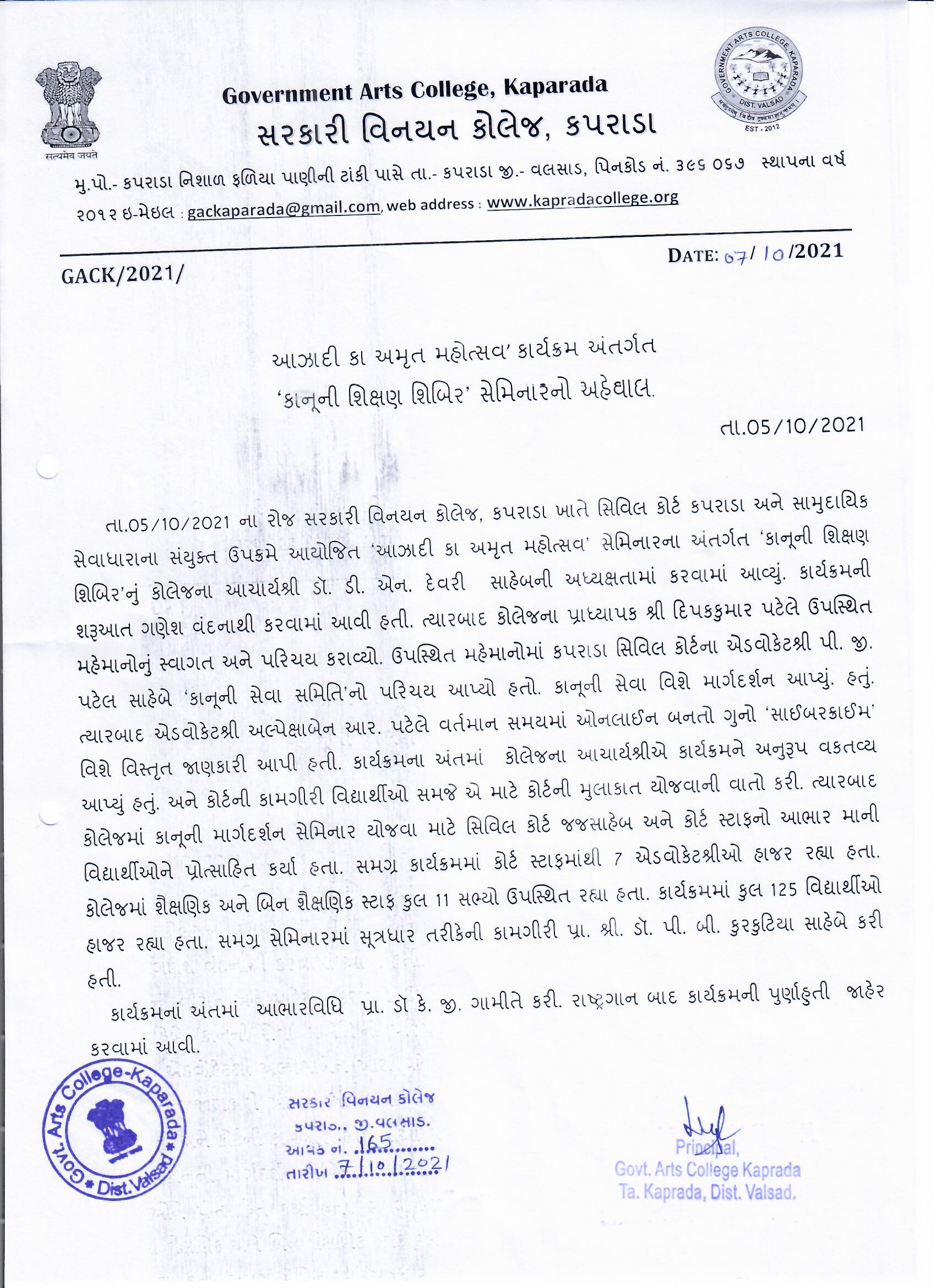 સીવીલ કોર્ટ, કપરાડા અને સામુદાયિક સેવાધારાના સંયુક્ત ઉપક્રમે આયોજીત ‘આઝાદી કા અમૃત મહોત્સવ કાર્યક્રમ’ અંતર્ગત કાનૂની શિક્ષણ શિબિર સેમિનાર તારીખ : 05/10/2021 શૈક્ષણિક વર્ષ-2021-22 |
